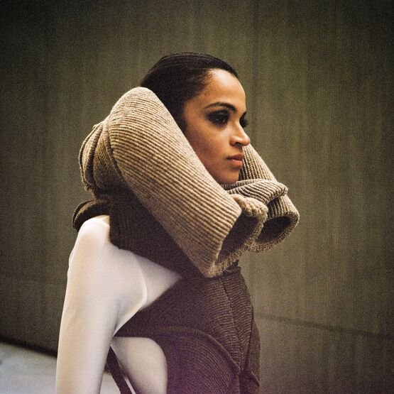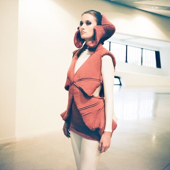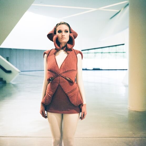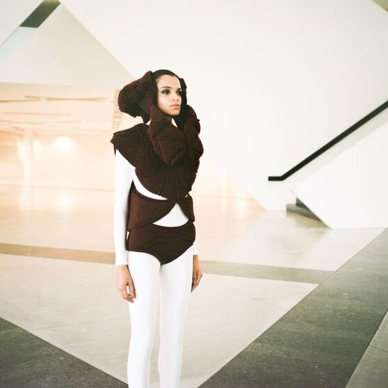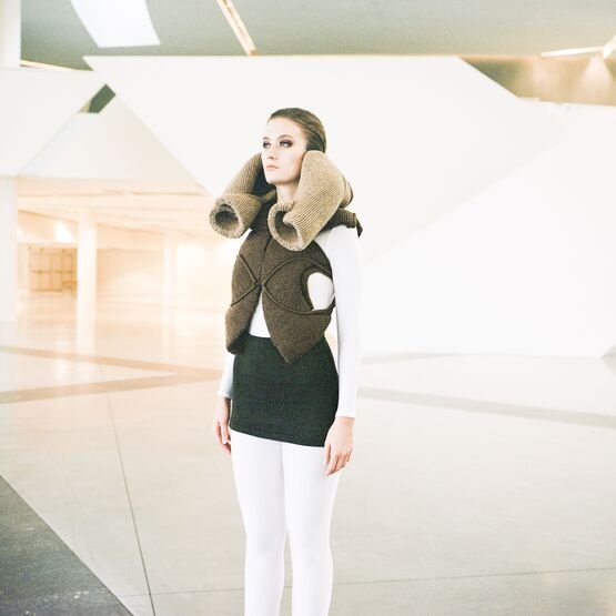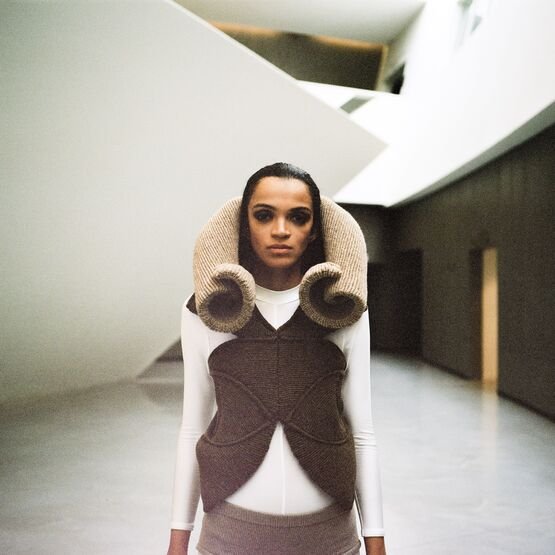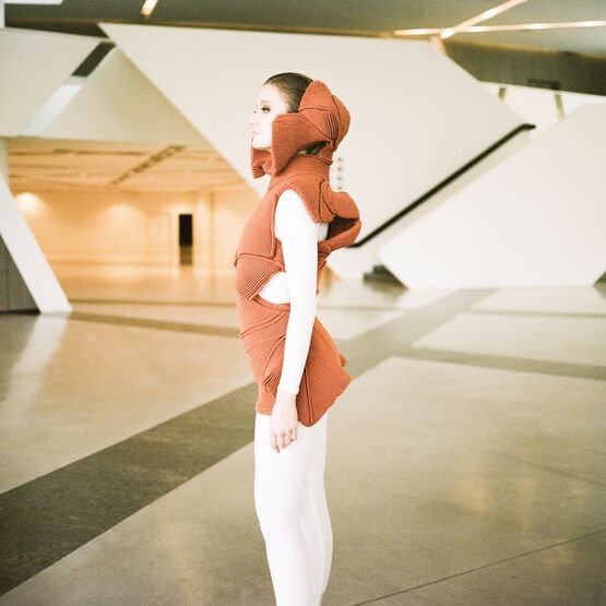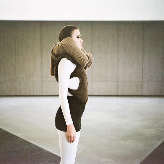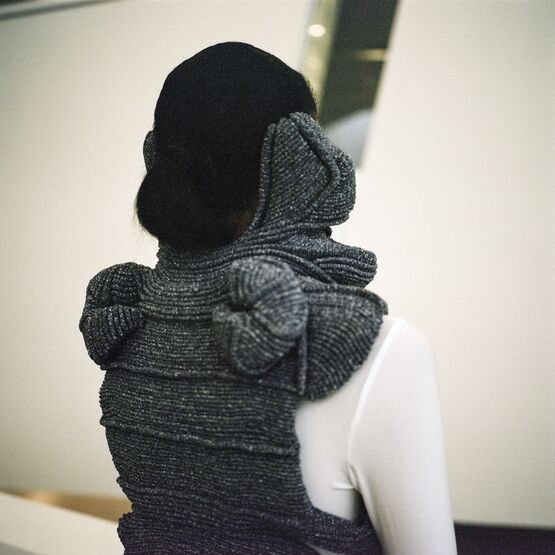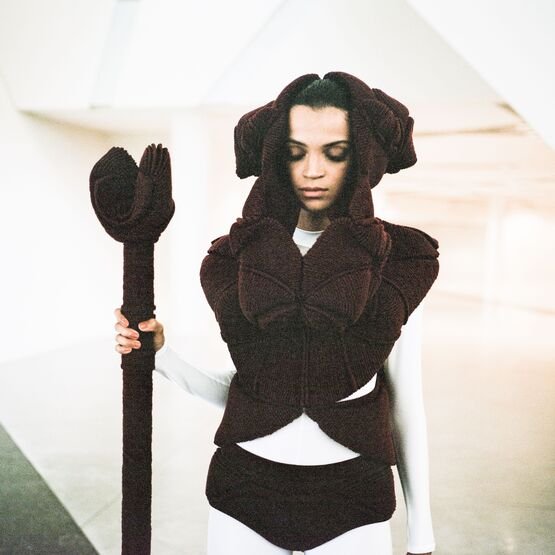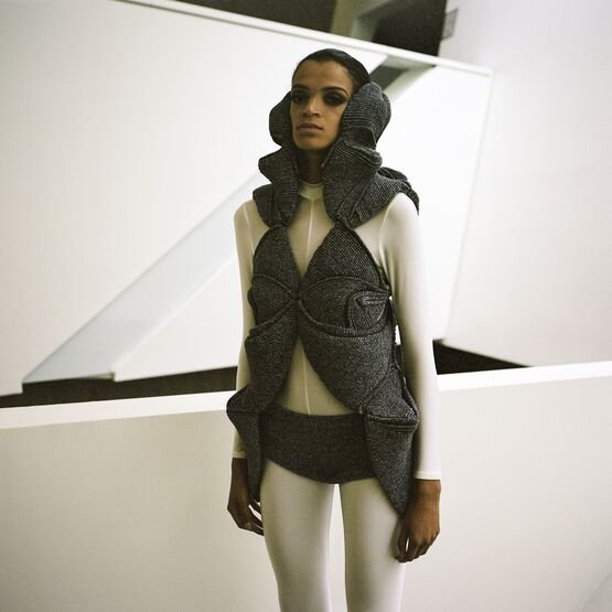 In the knitwear first, as each silhouette is a challenge in its realisation. The technical boundaries are pushed as many of the Hautes Sculptures à Porter are knitted in one single panel. Considering the volume with and without the body, the piece can transcend to become a sculpture, an abstract object, a relic that an archaeologist would find while time-traveling to the future.